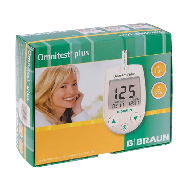 Blutzuckermessgerät zur Verwendung mit Omnitest plus Teststreifen. Eigenschaften: automatischer Messstart, nur 1 µL Blutprobe wird benötigt, Messzeit 5 Sekunden, Messbereich 10 - 600 mg/dL (0,6 - 33,3 mmol/L), das Blut wird automatisch von der Kapillare aufgenommen, Codierung komfortabel über Tasten, Temperaturbereich 10 - 40°C, Temperaturwarnung bei Umweltbedingungen außerhalb des spezifizierten Bereichs, Streifenauswurf, um ein Anfassen des Teststreifens nach dem Blutauftrag zu vermeiden, Speicher für 250 Messwerte mit Datum und Uhrzeit, die gespeicherten Daten können auf einen PC übertragen werden. Kompatibel mit Diabass Software, umschaltbar mg/dL - mmol/L, Durchschnittsberechnung von 3 frei wählbaren Zeiträumen, 5 verschiedene Alarmzeiten.